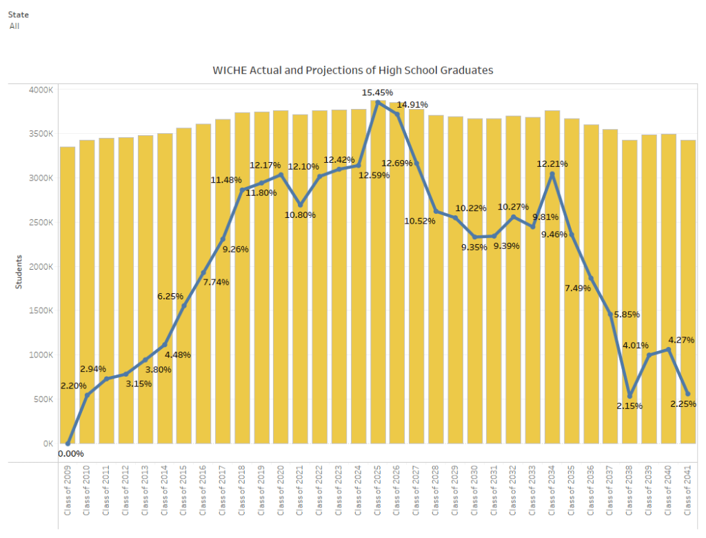 The headlines tell you the number of high school graduates is likely to plummet by over 11% between 2025 (the peak year) and 2040. This is, perhaps, a good example of the anchoring fallacy. What if you took a longer look?