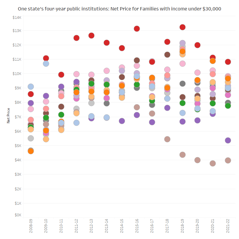 And, of course, it’s important not just to consider what you get, but what students and parents pay out-of-pocket, either via cash or loans. Consider your predicament if you’re at the four-year public institution indicated by the red mark in this Midwestern state: The cost for a family with income under $30,000 per year is still (after several years of decreases) still $11,000, while one of your competitors is showing a price of about $4,000 (which still seems high.)