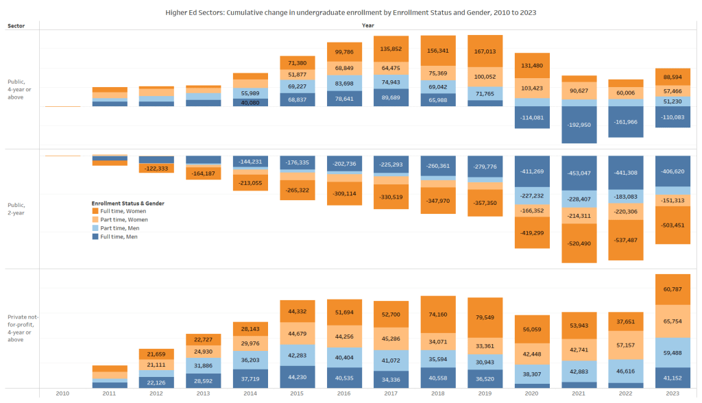 Here is the cumulative change since 2010. The length of the bar indicates the total change, with negatives below the zero-point on the y-axis. For instance, at two-year publics, the overall change has been negative, and the change in full-time women has been 503,000.