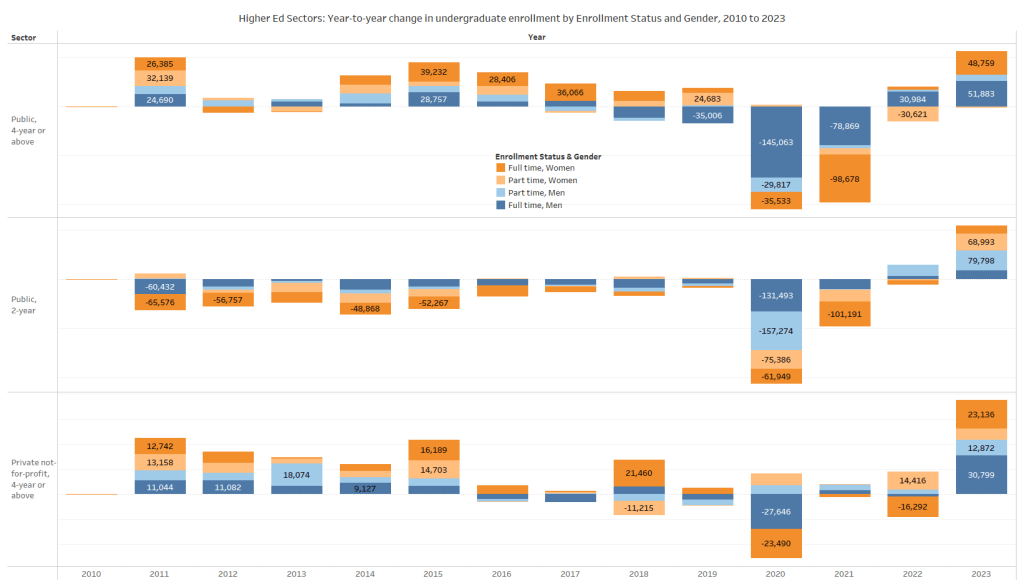 Here is the raw data at those three different sectors, broken out by gender and enrollment status. Don’t look at declines in one bar segment without looking at the others, lest you jump to hasty conclusions.