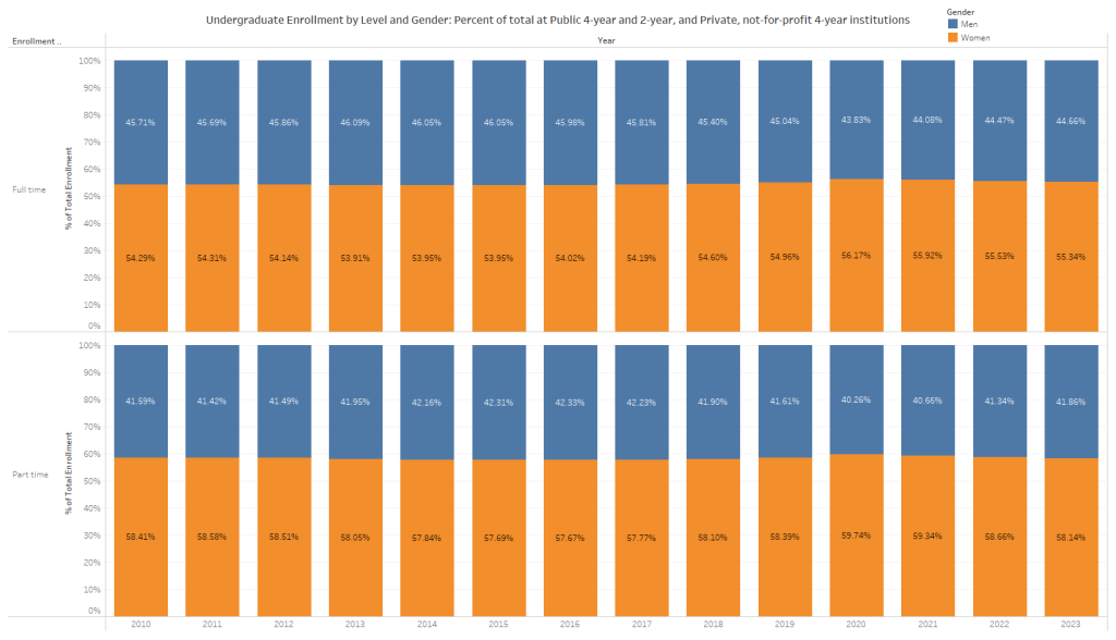 Here is the break out of gender balance going back to 2010. Shorter: If you walked around the average college campus ten years ago and today, you wouldn’t notice any difference.