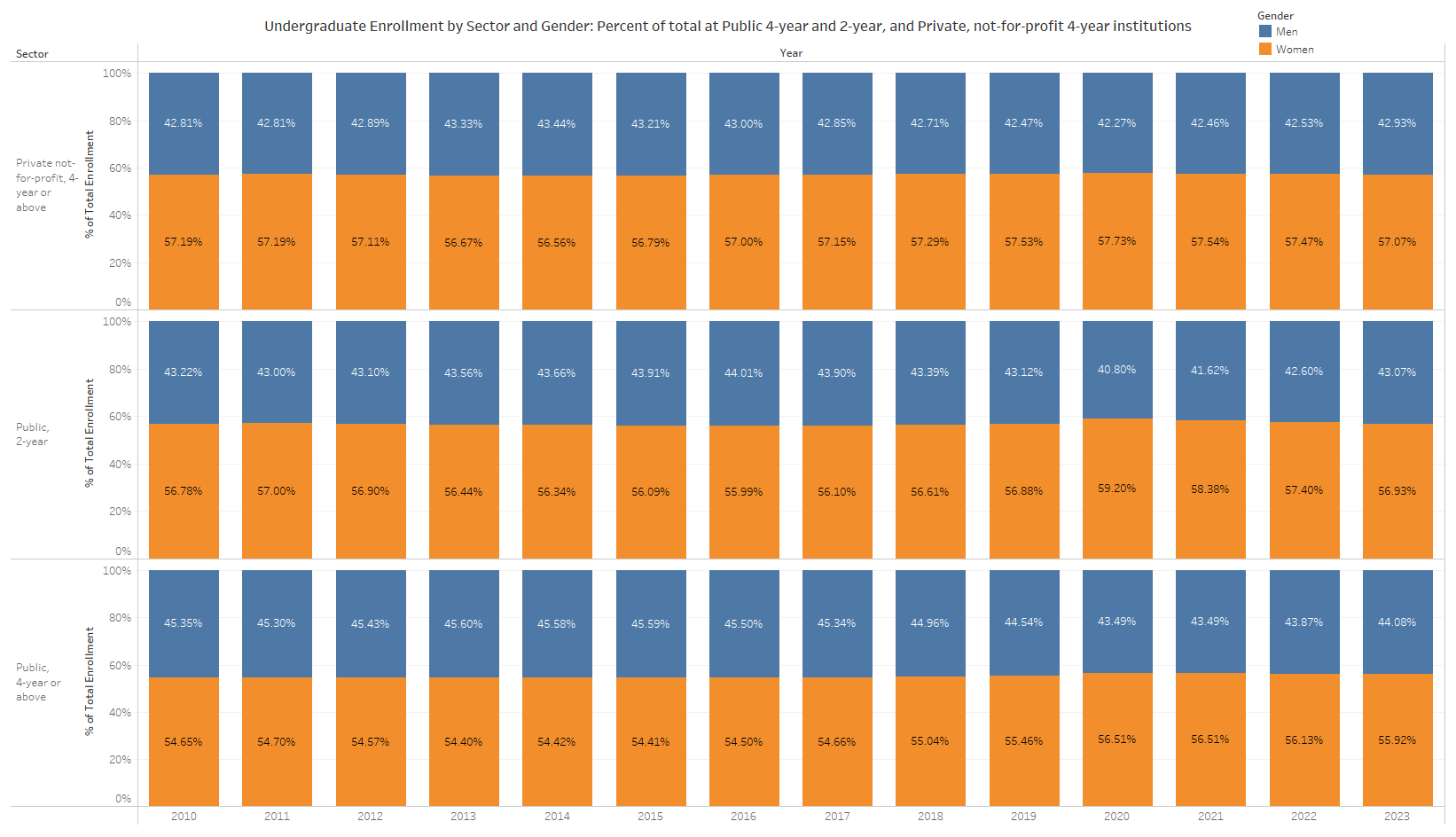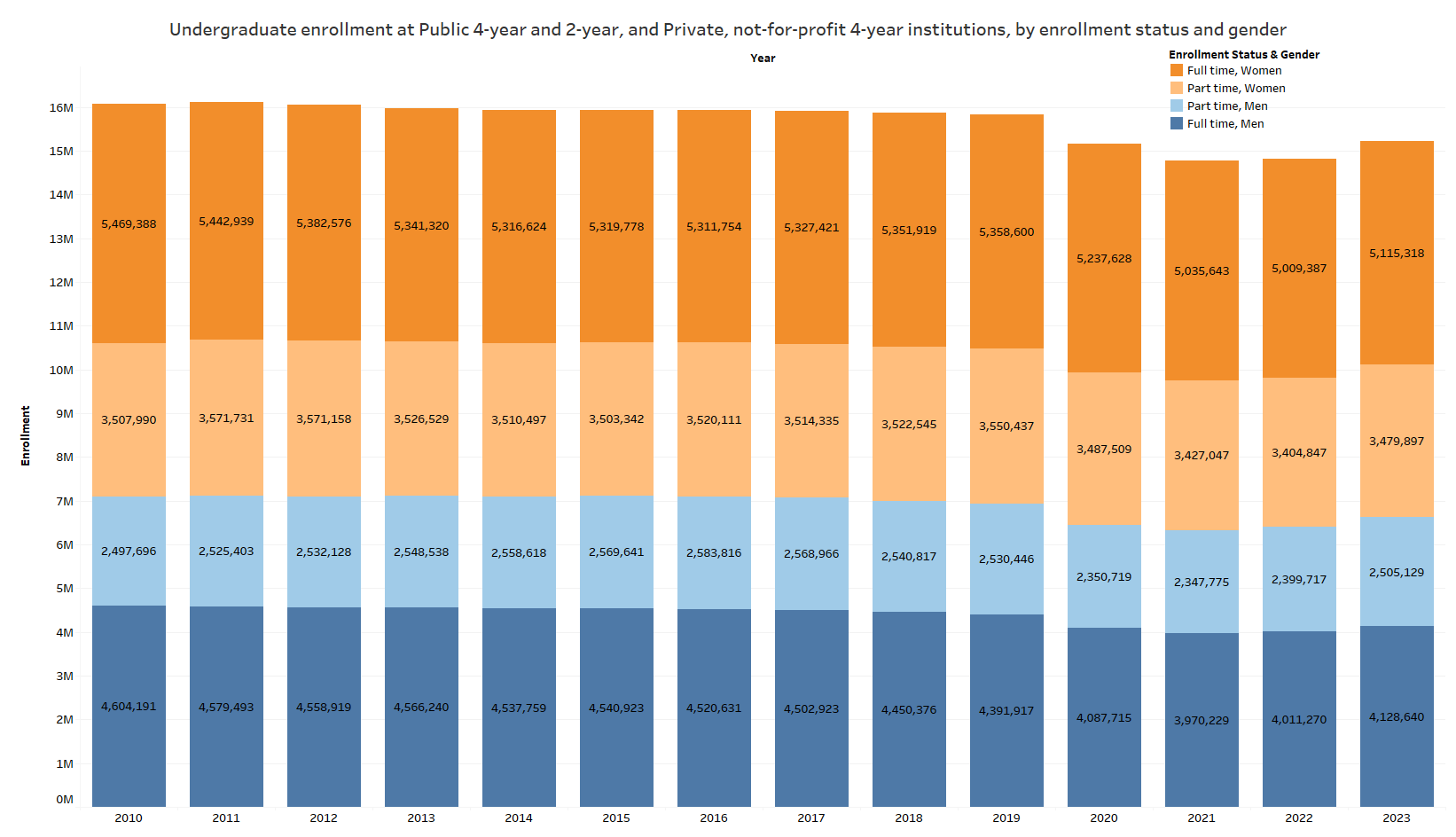 Some housekeeping: Click the images for a full-sized view. Second, for all of these charts, I’m showing undergraduates at three sectors: Four-year public, two-year public, and four-year, not-for-profit private institutions only for the sake of clarity. It’s my hypothesis that this is what people mean when they say, “college.” Finally, as you’ll see at the end, even this might not answer your questions. But it’s a start.