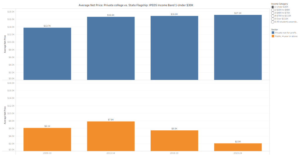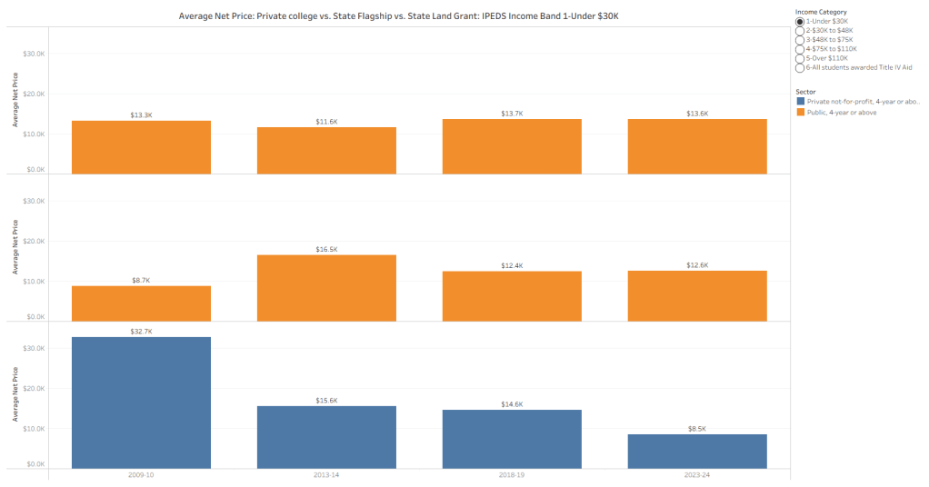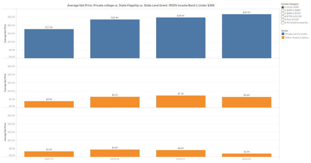 For this example, I looked at student’s net price for families from incomes under $30K. The results are surprising, both in the shape and the size of the discrepancies, and the patterns over time.